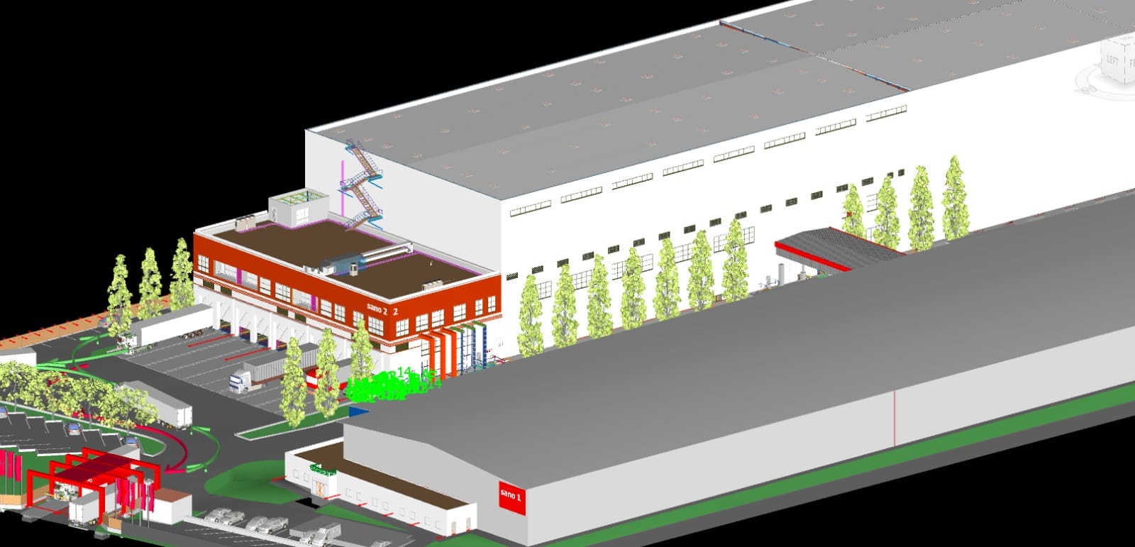 The project includes packaging and distribution areas, an energy center, offices, and site development.